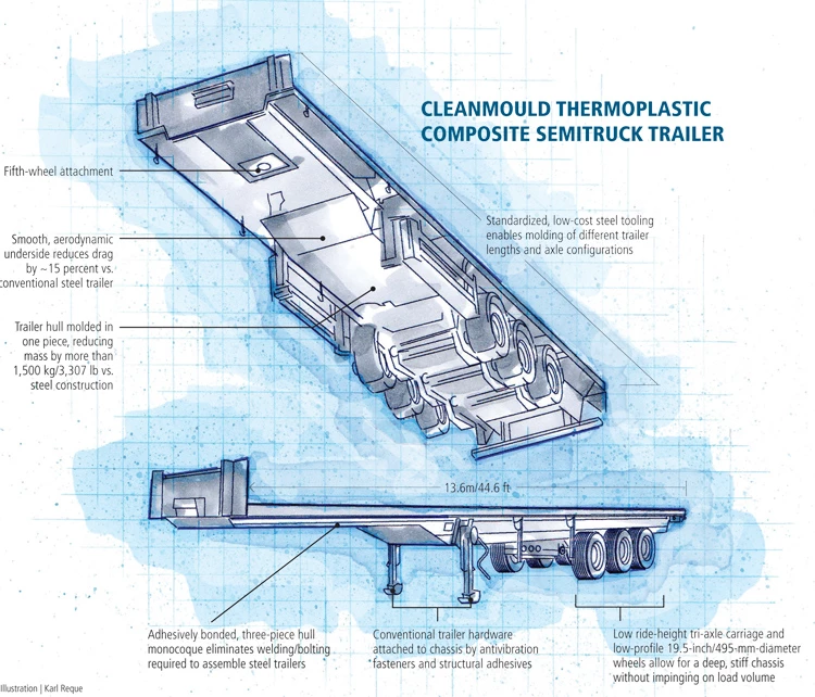 A Europa tem lutado há muito tempo com os altos preços dos combustíveis, então OEMs e fornecedores de veículos geralmente lideram a indústria de transporte no uso de compósitos para reduzir a massa de veículos. Não foi surpresa, então, que um consórcio de empresas principalmente europeias tenha concluído recentemente o programa Cleanmould, um esforço de três anos para projetar e produzir um semi reboque.